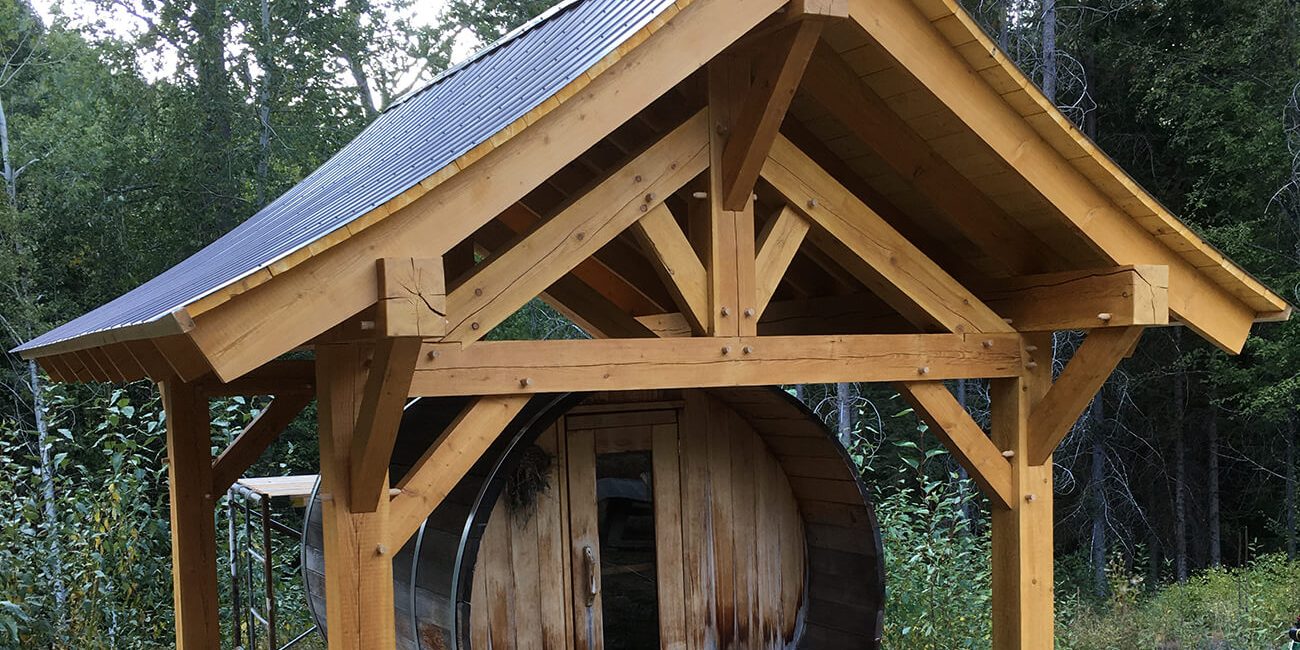 This structure was designed to protect the barrel sauna from the high snow loads of the alpine area. Hand crafted from Douglas fir, we used traditional mortise and tenon joinery methods with dry oak timber pegs to secure the joinery. Its arched roof gives it a tranquil aura reminiscent of Japanese architecture.